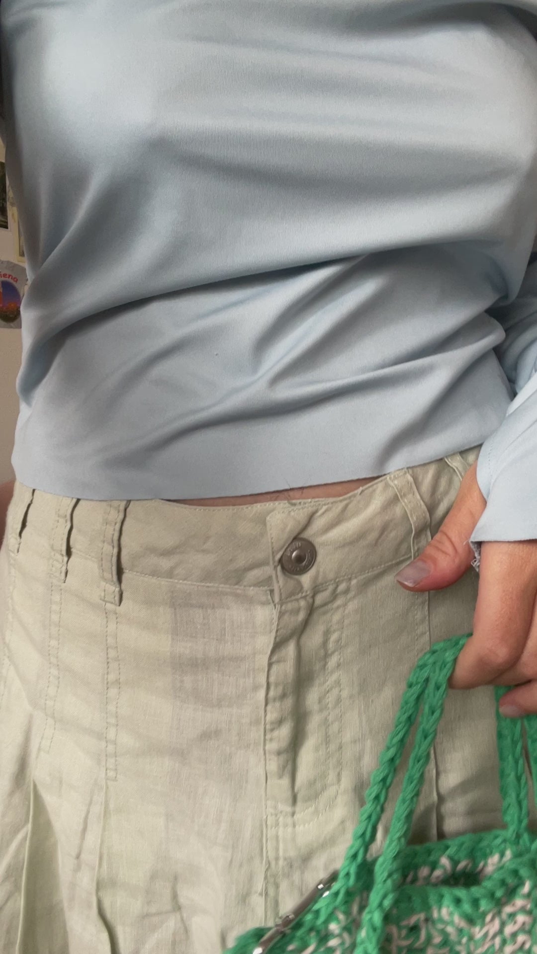 The bag is made up of three panels, a contrasting stitch with two short bag handles, and two long straps attached with carabiners. It can be worn as a tote bag or crossbody.